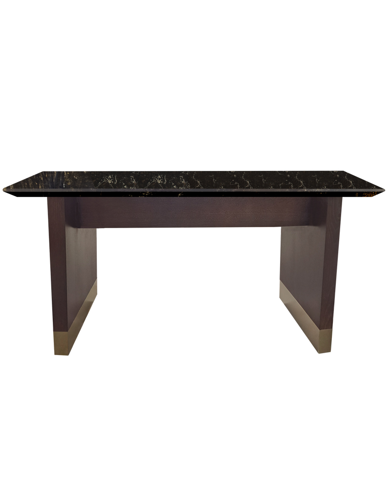 Solid Wood Base, 54” x 24” Rift Cut Red Oak Finished in P104 Wenge with Metal Trim in Octolux Bru5 Brushed Bronze Java Noir Quartz Top 34” x 72” with 1.5” built up Knife Edge.